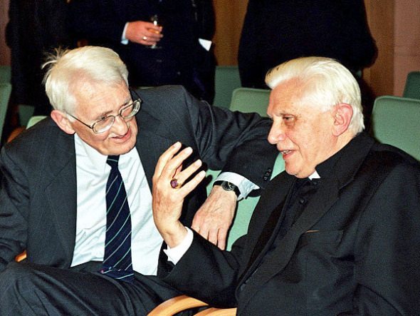 Habermas (on the left) was and still is a public intellectual of the highest standing. He left no stone unturned and engaged all of the intellectual currents in society – a true philosopher. Here he is with then-Cardinal Ratzinger discussing the nature of the justification of religious claims.