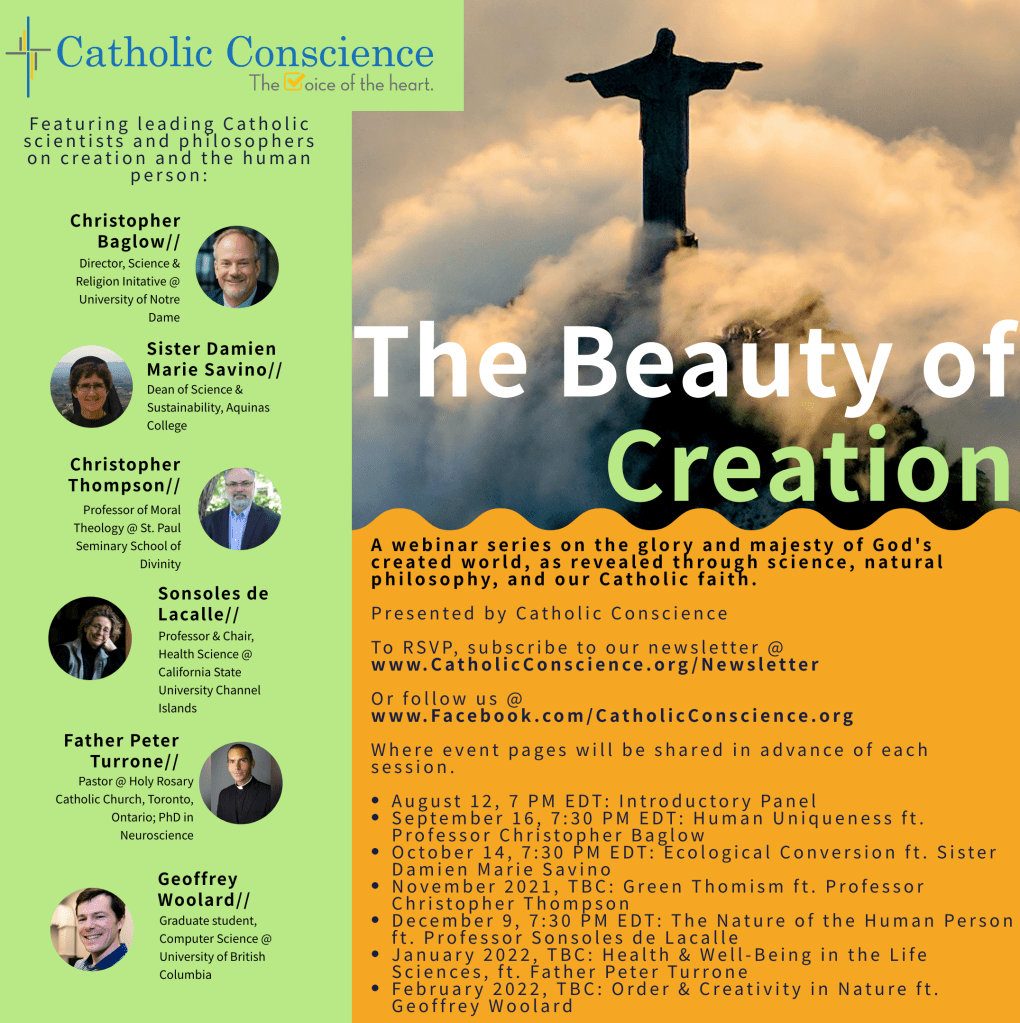 In an upcoming speaker series at Catholic Conscience, Geoffrey Woollard and Peter Copeland will engage with leading scientists, philosophers, and theologians whose work is nourished by a Catholic Christian understanding of the world. Through their work, as well as an engagement with Catholic social teaching and the latest work in the Magisterium of the Church, we hope to come to a greater appreciation of the integrity and beauty of creation that is a hallmark of Catholicism.