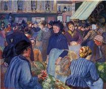 Clockwise from Top left: The Market at Gisors – Camille Pissaro (1899), Marketplace, Gisors – Camille Pissarro (1891), The Old Market at Rouen – Camille Pissarro (1889), The Marketplace surrounding the church of St Jacques, Dieppe – Camille Pissarro (1901), The Market in Pont L’Abbe – Zinaida Serebriakova (1934), Palm Market with Spassky Gate – Boris Kustodiev (1917). *Images taken from Wikimedia Commons