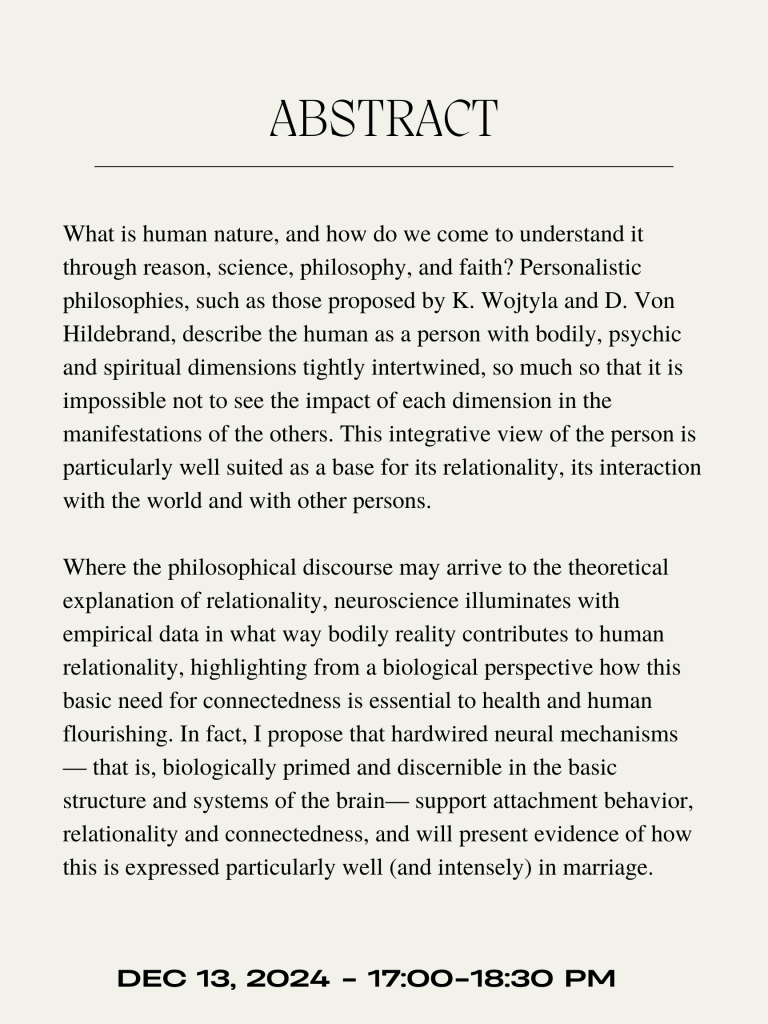 Where the philosophical discourse may arrive to the theoretical explanation of relationality, neuroscience illuminates with empirical data in what way bodily reality contributes to human relationality, highlighting from a biological perspective how this basic need for connectedness is essential to health and human flourishing. In fact, I propose that hardwired neural mechanisms — that is, biologically primed and discernible in the basic structure and systems of the brain— support attachment behaviour, relationality and connectedness, and will present evidence of how this is expressed particularly well (and intensely) in marriage.