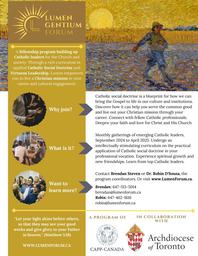 As lay people, we “seek the kingdom of God by engaging in temporal affairs and by ordering them according to the plan of God… [working] for the sanctification of the world from within as a leaven… [making] Christ known to others, especially by the testimony of a life resplendent in faith, hope and charity” (Lumen gentium 31). The Lumen Gentium Forum exists to empower Catholic lay professionals living this calling in their careers. We do this by offering them intensive education in Catholic social teaching and its practical application for their professional vocations, as well as the telos (ultimate aim) of their institutions: the common good and the human dignity of all. Through this method, we support the critical mission of “enriching and permeating society itself with the Gospel” (Compendium of the Social Doctrine of the Church).